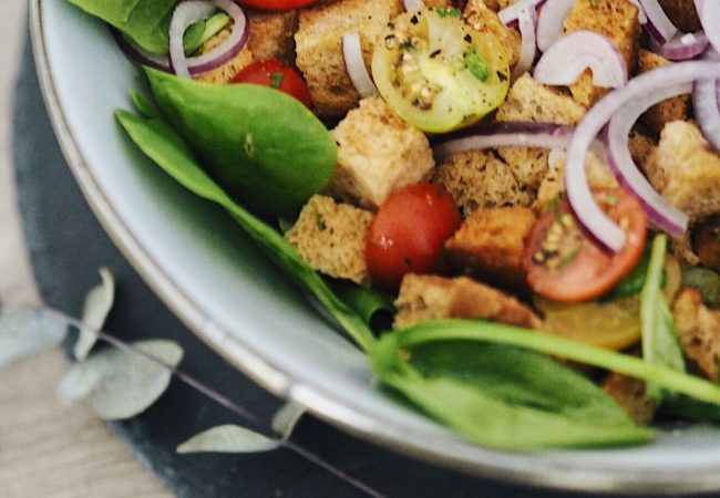 120-150g trockenes Brot (Leib oder Brötchen) 2 Knoblauchzehen Olivenöl (zum Rösten) 200g Kirschtomaten (gerne bunt) 50g Babyspinat 1 große rote Zwiebel 2 Hände Basilikumblätter 6EL Olivenöl (fürs Dressing) 3EL Rotweinessig 1-2TL brauner Zucker frisch gemahlener Pfeffer Salz
