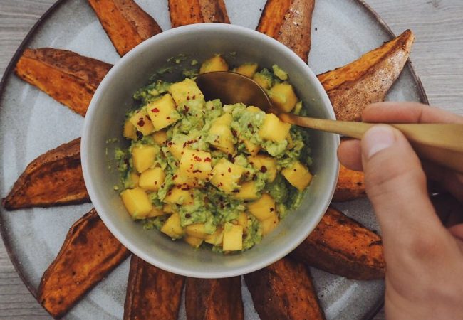 1 große Süßkartoffel 2 EL Sonnenblumenöl 1TL Paprika (edelsüß) 1/2 Teelöffel Pfeffer 1 Avocado (essreif) 1/2 Mango 1/2 Bund Petersilie 2TL Zitronensaft Salz Pfeffer Backpapier