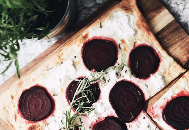 Für den Teig: 150g Magerquark 5EL Milch 6EL Olivenöl 1TL Salz 300g Mehl (Type 405) 3TL Backpulver Für den Belag: 150g Magerquark 150g Schmand gekochte rote Bete (400g) 100g Ziegenkäse Milch Salz Pfeffer Honig frischer Rosmarin