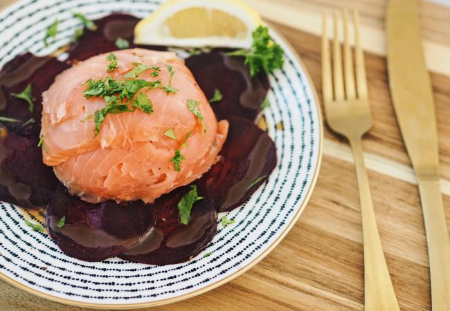 4EL Olivenäl 2EL Balsamico 2TL Honig 1 Zitrone 100g Skyr (z.B. von Gutes Land) 50g Schmand 1/2 Gurke (z.B. von Markttag) 1/2 Strauch frische Petersilie (z.B. von BioBio) 1-2 Kugeln Rote Beete (gekocht) 200g Bio-Räucherlachs 2 Scheiben Toastbrot feines Meersalz frisch gemahlener Pfeffer