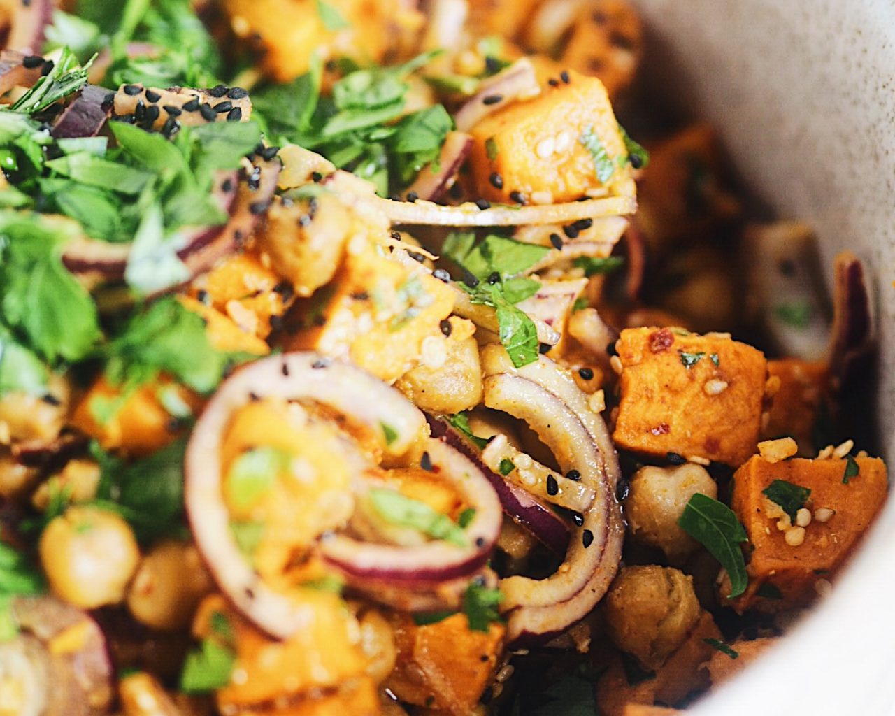 - Wenn die Zeit abgelaufen ist, gebt ihr die gerösteten Kichererbsen und Süßkartoffelwürfel in eine Servierschüssel, verteilt euer Dressing darüber, gebt die Zwiebeln sowie die Petersilie dazu und mischt alles gut durch, damit der Geschmack vom Dressing sich überall verteilt.