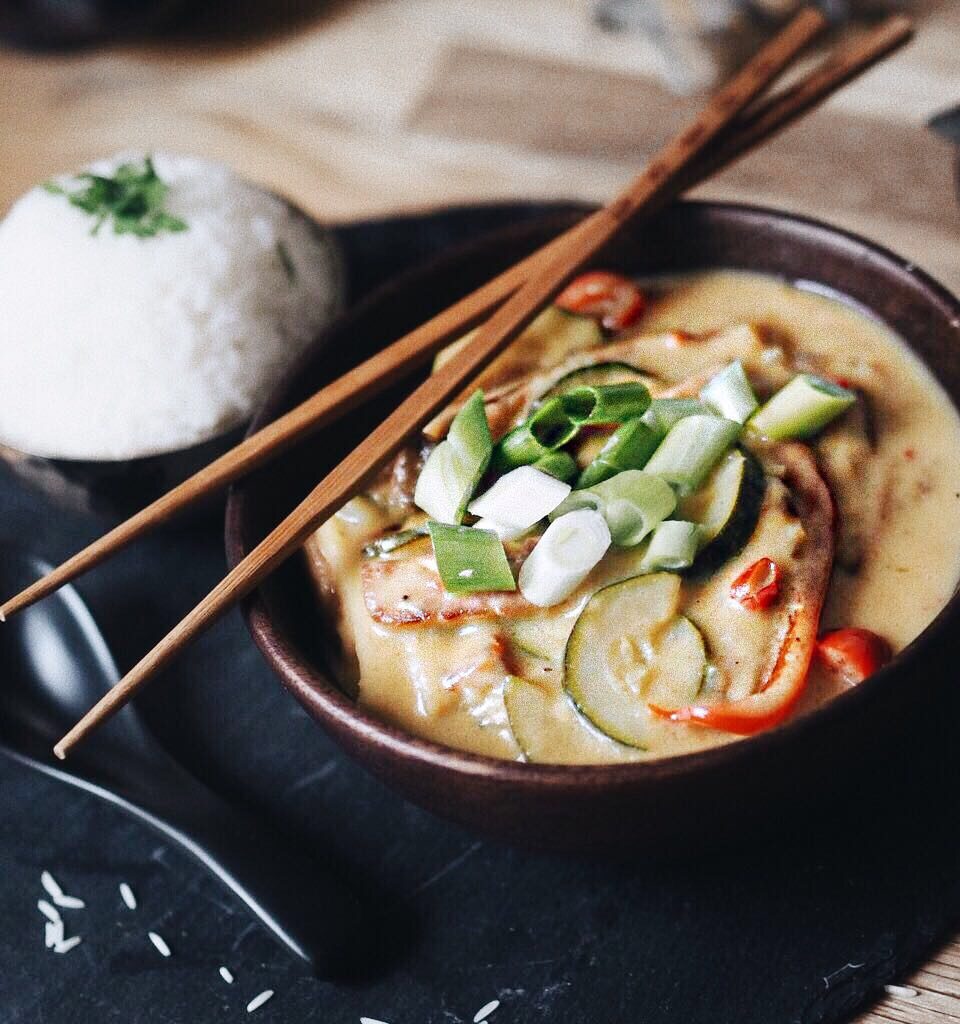 Schlussendlich, braucht es ein paar einfache Zutaten, etwas Vorbereitung und einen Wok* oder eine große Pfanne mit Deckel. Als Resultat, bekommt ihr ein tolles Gericht mit einer fruchtigen Mangonote, cremiger Kokossoße in frischem Gemüse und knusprigem Tofu, zu aromatischem Reis 🥘🍚👌🏼