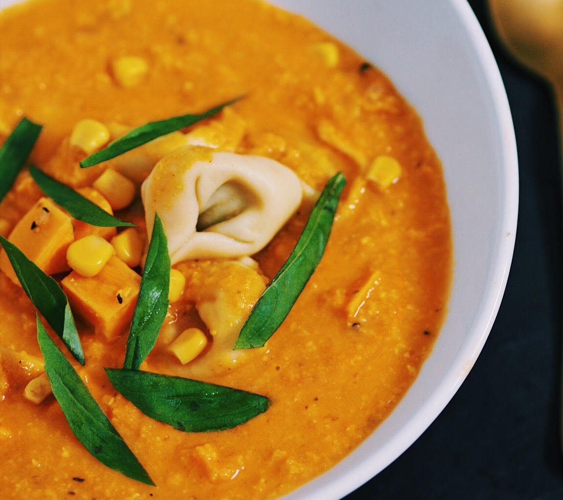 Was ich euch geschmacklich zu dieser hervorragenden Suppe sagen kann, ist, sie hat eine wunderbar cremig-süßliche Note in der sich der Mais und die Süßkartoffel aromatisch perfekt ergänzen. Nur noch besser wird dieser in Verbindung mit der Säure aus der frischen Limette, welche der Suppe eine herrliche Frische verleiht. Ähnlich wie bei dem Rezept für das Kichererbsencurry, macht das einen wirklich Anteil am geschmacklichen Erlebnis aus, wenn diese Aromen sich miteinander verbinden. Die zugefügten Tortellini geben der Suppe noch etwas Biss und die Füllung aus Spinat-Ricotta fügt sich hervorragend ins Gesamtbild ein. Die Streifen aus fein geschnittenem, frischem Basilikum werten das Gericht optisch noch ein weiteres Stück auf und verleihen der Suppe obendrein gleichzeitig noch etwas Süß-pfeffriges. Wenn ihr also der Meinung seid, das hört sich schon großartig an, dann probiert dieses Gericht unbedingt aus. 😌