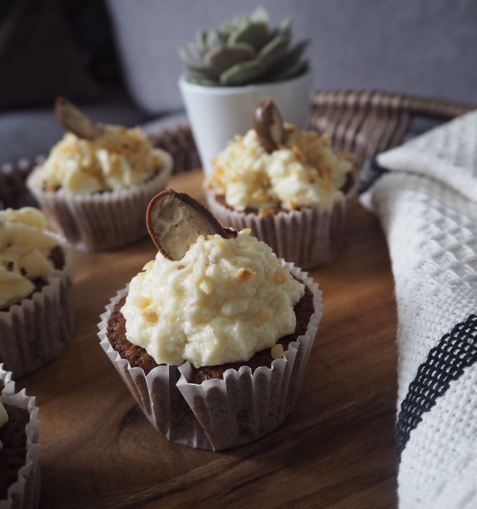 - Nun müsst ihr nur noch 6 Schoko-Bons mit einem scharfen Messer der Länge nach halbieren. Dann verteilt ihr die letzten 20g der gehackten Haselnüsse auf den Cupcakes und setzt jeweils einen halben Schoko-Bon oben auf die Spitze des Frostings. Genießt den Anblick und lasst sie euch schmecken 🙂