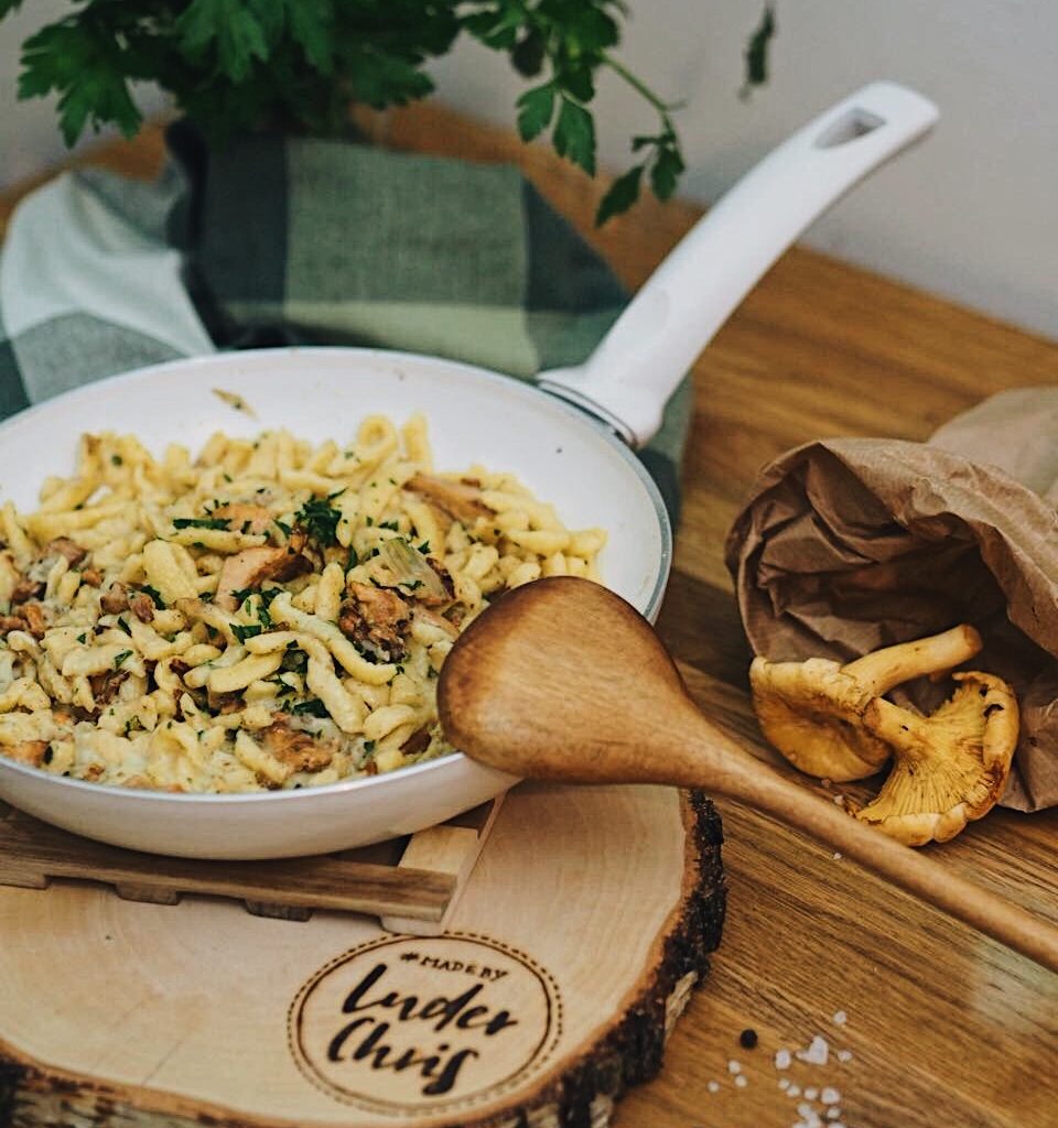 - Die Spätzle hab ich als Convenience-Produkt aus dem Kühlregal meines Supermarktes. Diese sind für das Gericht absolut angemessen. Selbstgemachte, frische Spätzle wären hier natürlich auch sehr passend gewesen, aber dafür fehlte mir die Zeit und das Know-How (noch) 😉