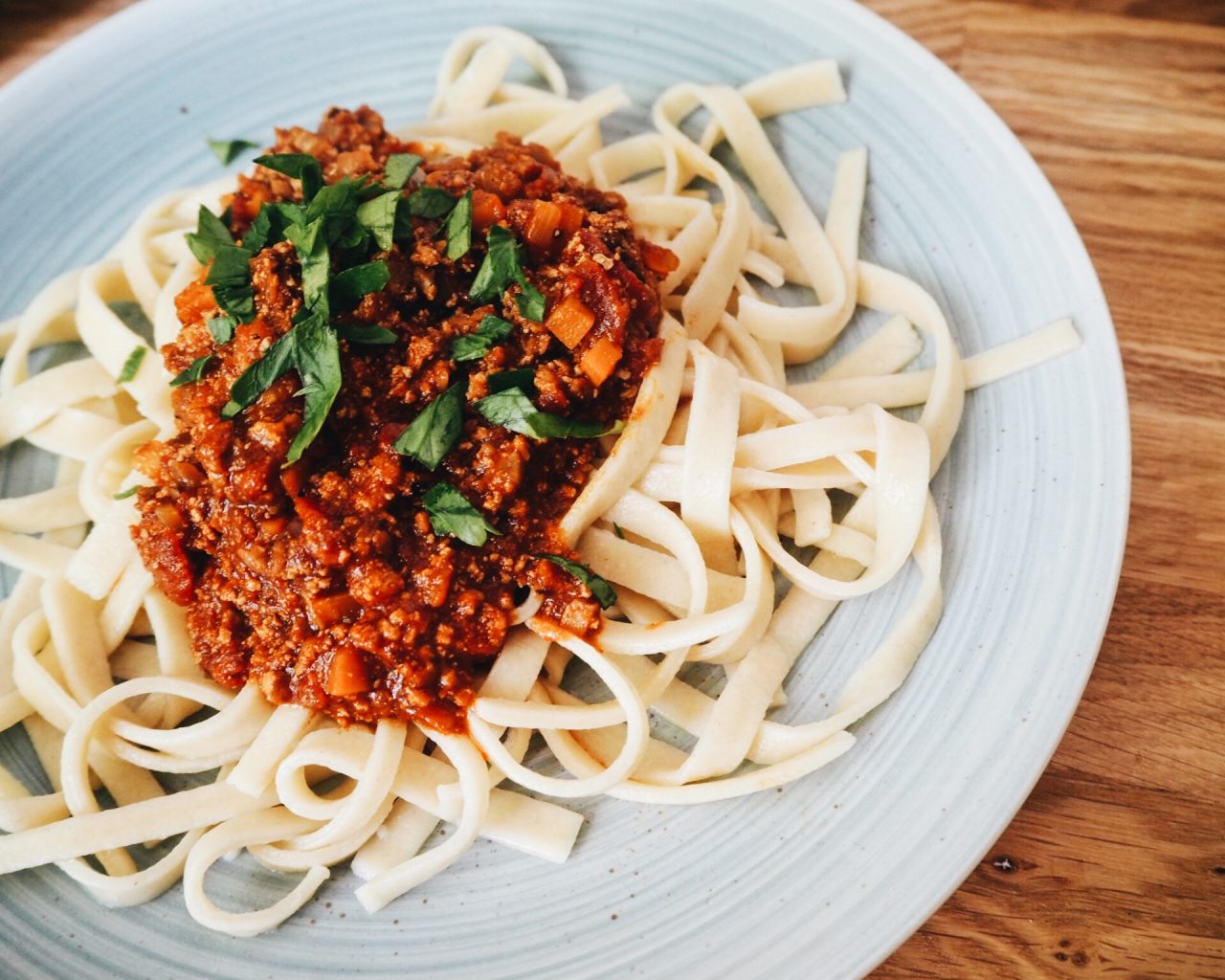 Wenn ich diese Tage meine Einkaufsliste mache und die Gerichte für die kommende Woche plane, freue ich mich, wenn ich dafür eine kleine Flasche Rotwein auf die Liste setze, das frische Gemüse besorge und wie in diesem Fall, auch noch die Nudeln hausgemacht sind, damit ich am Ende sagen kann: „Alle Komponenten dieses Gerichts habe ich selber gemacht und ich weiß genau, was da wie verarbeitet wurde!“ Auch wenn es sich nach einer Menge Arbeit anhört, ist dieses Rezept immer noch eine relativ simple Variante dieses beliebten Gerichts. Bei Bolognese können vor allem echte Italiener hochgradig wissenschaftlich werden, denn nicht selten werden dafür drei unterschiedliche Fleischsorten zu Hackfleisch verarbeitet und es kann Stunden brauchen, bis alle Zutaten zu der perfekten Bolognese verschmolzen sind. Für den Hausgebrauch muss es aber in einer gewissen Relation stehen und bisher empfand ich dieses Rezept hier als einen guten Kompromiss 👌🏻