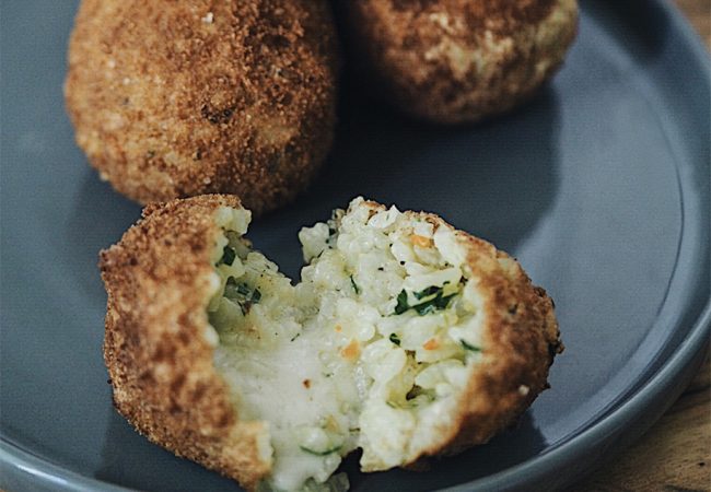 5 / 5 1 250g Risotto Reis3EL Butter1l heiße Brühe1 Bund glatte Petersilie125g Mozzarella2 Eier50g geriebener ParmesanSalzPfeffer6EL Mehl8-10EL Paniermehl1l Frittieröl